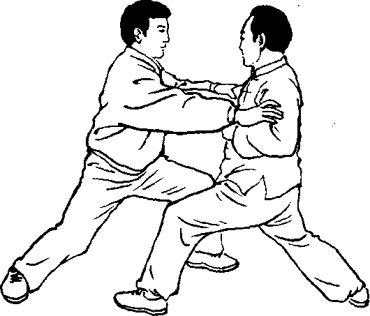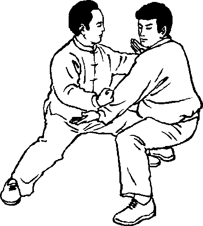 接掩手肱锤,设 敌人在我正面,左脚 在前,以双手抓住我 双腕,右手将我左手 腕扣于我左肋旁。左 手将我右腕抓住向我 右前方弓I,欲变招胜 我。我即乘势先略向 左转再向右转下沉。 同时双拳先逆缠略外 开引化敌人双手抓我 双腕之劲,使其双手 劲减弱或处于背劲。然后我双拳继续双逆缠里合,以左臂肘逆缠截 敌右腕,并乘机以肘向敌人胸部击去,如距离稍近,则用下采劲以 左拳向敌裆内采击。同时我右拳上翻里合向敌右耳门合击,如距敌
