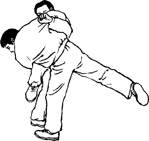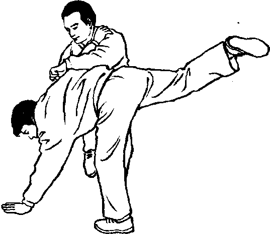 合击.在提膝转体时,右腿还可以扫击敌人之左脚。(图388、389) 转体有两层技击含义,一是为了击打前方之敌,一开一合一旋 转,靠转体时肘、膝、拳的螺旋搠劲击打正面之敌人;二是为了转过 身来以右肩、右肘发螺旋后靠劲,击打身后敌人。