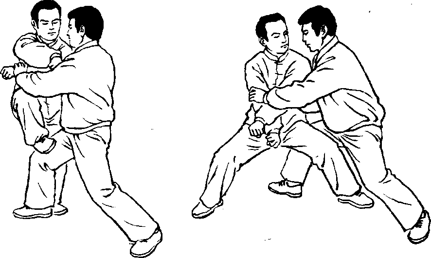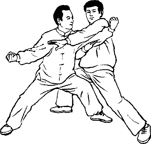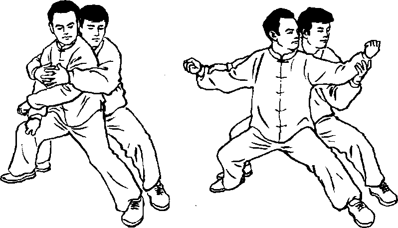 反过来说,开又是为了合。如敌人抓住我两臂施按劲,里合劲, 我两臂展开,为了加大敌人的里按里合劲,于是我突然借用敌人这 种里合劲,双拳、双臂交叉,向前下沉,以双拳、腕背、臂肘击打敌人 已暴露的胸口,以及腹部。所以说,开为了合,合为了开,合、开都可 以打人。此乃太极劲之阴阳妙用也。