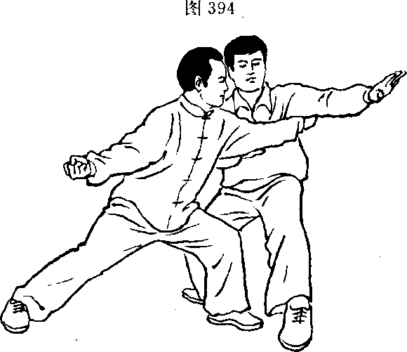 另夕卜,蓄劲时,要注意丹田气下沉,内气蓄足,然后内气走裆, 走命门,气贴脊背;放劲时,内气鼓荡,丹田带动,劲走三节,节节贯 串。拳论云“聚如婴儿,发如闷雷”,“周身柔软似无骨,忽然放开都 是手”。此式体现最为清楚。(图390、391)