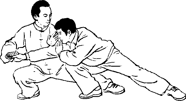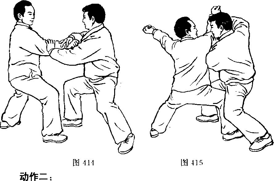 接掩手肱锤,设敌人在我身右侧,以右手抓住我右腕,并以左 手抓住肘关节,双手施按劲,欲将我向左方推出摔倒。我即乘势身 向左转略上升,右腿以脚跟为轴,脚尖里勾、贴地向右后方蹬出.同 时我右拳先逆后顺缠向右前上,再里合到两眼中线前上方引进,使 敌人双手按劲落空失势。同时我左拳由左肋部先逆后顺缠,先略外 开略下沉,再向左前上与右拳相合,以维持身体平衡。这是上引下 进之法。(图414,415)