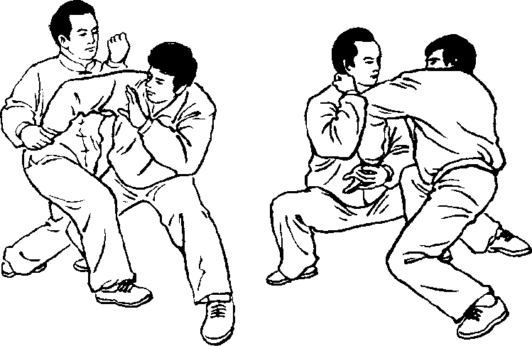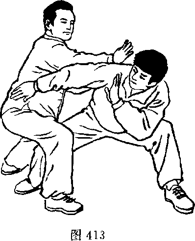 接上动作,设敌人双手按劲被我上引下进而落空,身前倾失 势,这时我应乘机以右臂、肘、拳逆缠下沉外撼,以右肘尖向敌胸、 腹等部横击。如敌人左转、含胸、塌腰避开我右肘罚出之劲,我即乘 势以左臂、肘、拳里合向敌面部右侧、右肩及后心击出。也可以右 臂、拳由敌左腋下穿出上搠里合敌人左肩,乘机将身贴近敌身,同 时我左臂拳里合下沉施采劲截敌人左臂手。运用右臂拳上搠里合 敌人左肩,及里合下采截敌人左臂肘之劲,同时运用腰胯之劲将敌 人向我左前下方摔出。(图416、417)