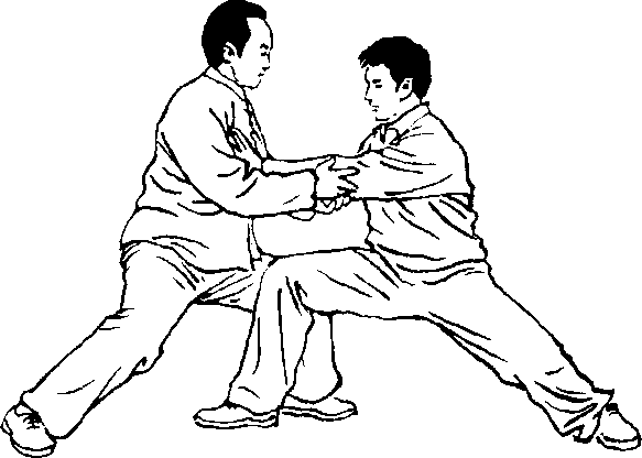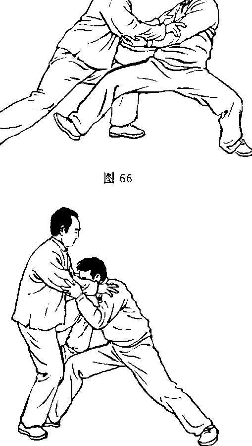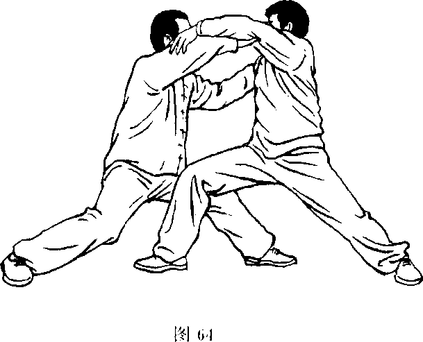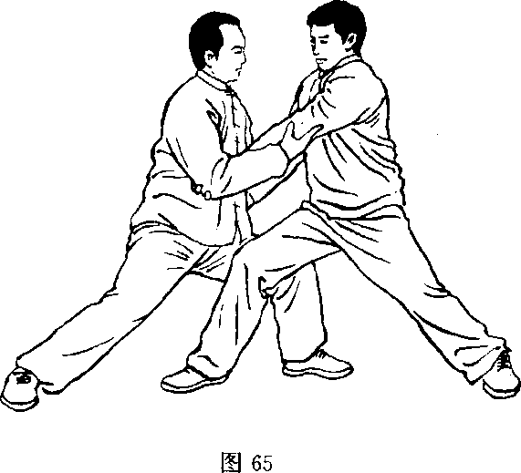 设敌人上右步 以双手掌向我胸前 推击。我即乘势以 双手臂开合的采、 捌劲横击敌左右肘 (横劲破直劲),敌 双手臂的直劲被击 截断。然后,我双手 合住敌双肘托端发 放之。(图63?65)