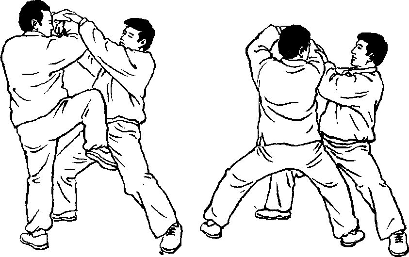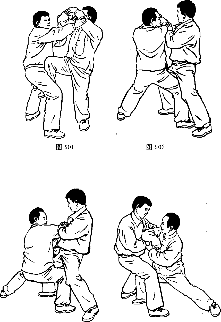 右肩肘,欲扭拿我右臂反关节,或双手将我搂抱施摔法。我乘势,双 臂向左上挪起,向上引化敌人按劲或环抱之劲,身下沉,提右腿,既 可以膝击其裆,又可踩蹬其右腿,或插入其裆,以备进肘。此时,敌 人胸腹部已暴露,我上搠之劲突然下沉,以右肘尖向右侧偏后猛击 敌胸、腹、肋部。左肘与右肘对称发劲击敌,或与右肘劲相称。(图 497?500)