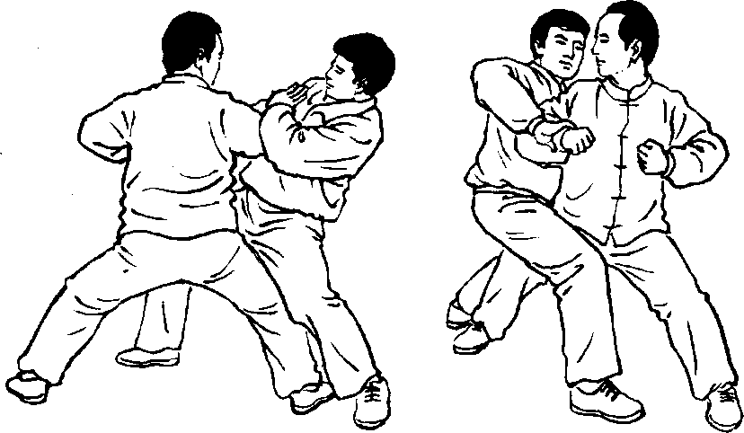 此式棚化与发劲和上式动作四五略同。不同之处,在于肘尖击 打的方位不同。前者是向右侧发平顶肘劲;此式是双肘向左侧偏 后、右侧偏后发劲,故又称后顶肘,以对付身后或右侧搂抱我的敌 人,如以对付右侧敌人为主,左肘则为称劲,以维护重心平衡。
