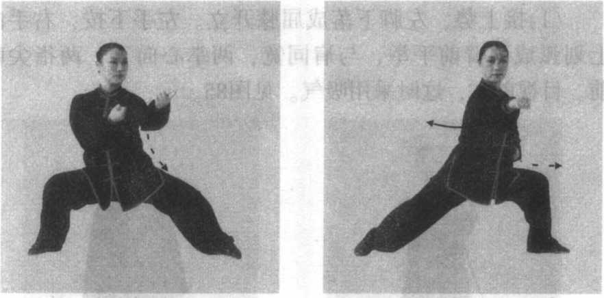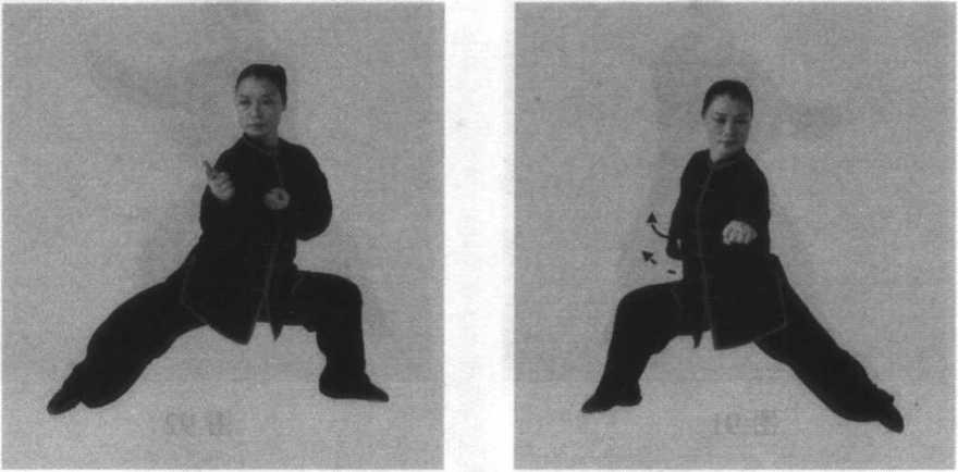 (1)接上势,身体右转,右腿弓膝成右偏马步。两手握拳, 右拳顺缠,左拳逆缠,两手同时向下经腹前向右转至右侧前 方。右拳心向上。左拳心向下,在右肘内侧。目视右前方。
