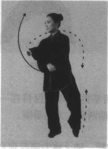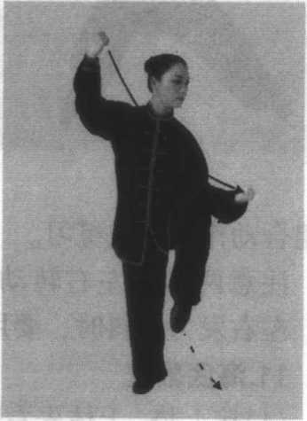 (3)接上势,左腿下落,重心移至左腿。右腿屈膝,脚尖 点地;同时,右臂内旋向下、向左划弧,左臂屈肘向右、向 下交臂握拳。目视左前方,这时采用吸气。见图97。