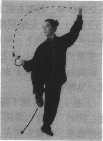 同时左拳向右、向下、向左经腹前外旋向左、向上屈肘举于 肩左前上方,拳稍高于头,拳心向右。右拳向左、向上在胸 前和左臂相会时经左前臂内侧再向上、向右经面前向下划 弧,外旋翻臂下压于右膝外侧约10厘米处,右臂屈肘,拳心 向上。目视右前方,这时采用呼气。见图98。