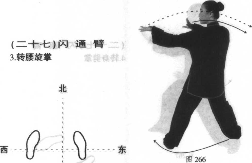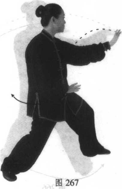 右掌。接着左脚尖内扣,上体微右转;左臂屈肘,左掌外旋 向上、向右划弧于左耳侧;右掌以腕关节为轴继续内旋,指 尖向左。掌心转向外。见图266。