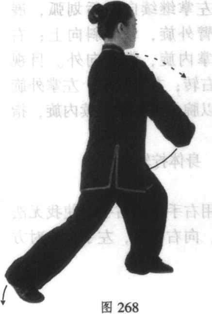 随之 左脚提起向前进半步,重心前 移成左弓步,右腿微屈。同时 两臂屈肘,左掌内旋向右、向 下划弧于胸前;右掌外旋向 右、向下划弧经右腰侧,掌心 转向上,继续向前划弧于胸前 时,两手相交。右掌经左前臂 上向前上方穿出于右肩前,腕 同肩高,指尖向前上方,掌心 斜向上;左掌向下、向左划弧于左胯旁,指尖向前,掌心向 下。目视右掌。见图264。