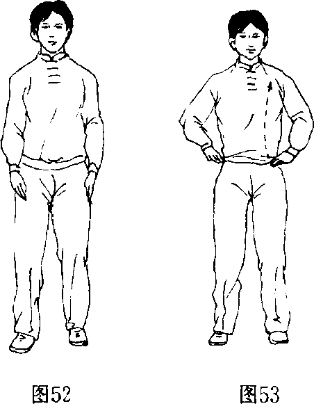 膝,左脚脚跟、脚尖依次离地慢慢提起向左开步,脚 尖、脚跟依次着地,全脚踏实。两脚相距同肩宽,重心 移于两脚之间。目前平视。(图52)