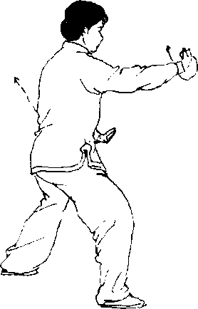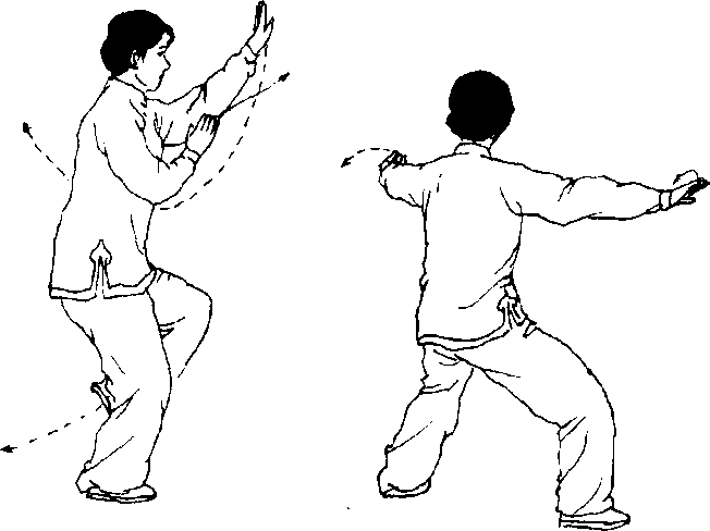 【要点】此式的每一分动,为一次倒卷肱。分动1 为右卷肱;分动2为左卷肱;分动3为右卷肱。卷肱与 退步要协调一致。