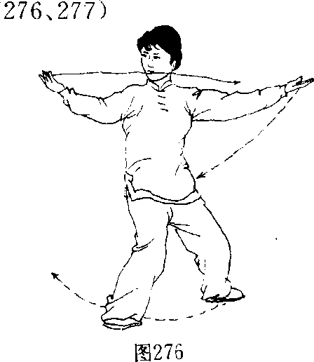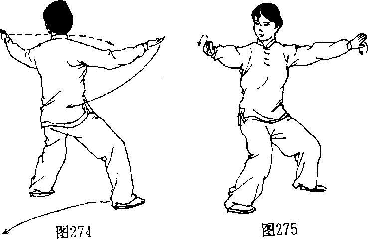 2 .退步推掌:身体微左转,重心稍移向左腿;同 时两手外旋掌心翻向上。随之重心移至左腿并屈膝, 右脚掌轻贴地面经左脚内侧向右后方弧形擦地退步, 身体右后转(胸向东南),两腿屈膝下蹲成左偏马步; 随转体左臂屈肘,左手经左耳侧向左前从右臂上展臂 推出,腕稍低于肩,指尖向左前方,掌心向外。右手随 体转向下、向右划弧于右前方,腕稍低于肩,指尖向右 前方,掌心向外;目视右手。(图274、275)