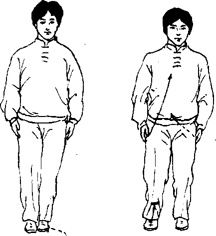 身体重心缓缓移至右腿,左腿屈膝,脚跟脚尖依 次提起,并向左跨步,两脚平行开立,两脚间距离同肩 宽,身体身然直立,两臂松垂、两手贴于大腿两侧,平 视前方。(图3)