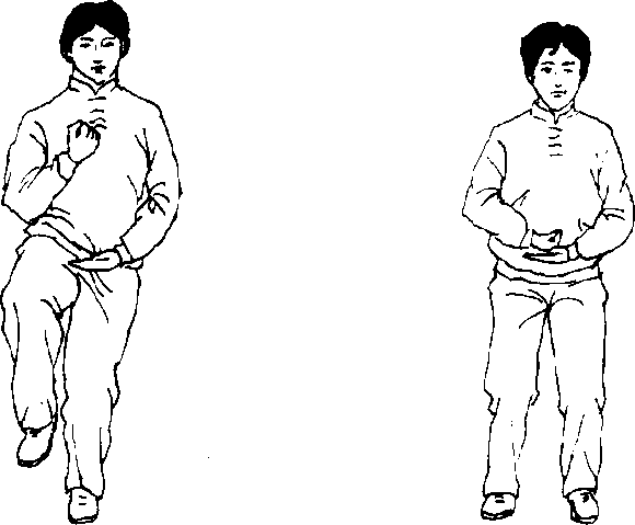 【要求】虚领顶劲,含胸拔背,两腿屈蹲,敛臀坐 胯,膝脚相对,身体中正,不偏不倚,心静体松,呼吸自 然。初练时,一次可静站3——5分钟,久练逐渐增加。