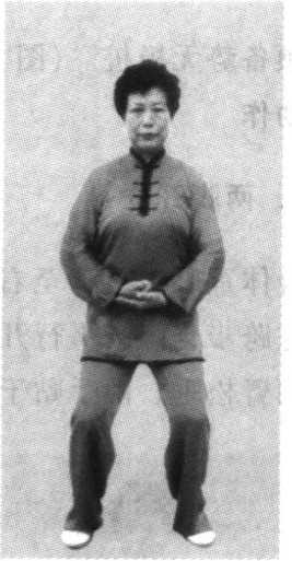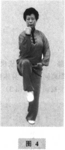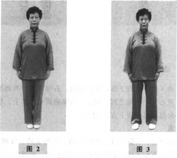 预备势无极桩。(图2)动作1. 两脚开立身体重心缓缓移至右腿,左腿屈膝,脚跟脚尖依次提起, 并向左跨步,两脚平行开立,两脚间距离同肩宽,身体自然直 立,两臂松垂、两手贴于大腿两侧;平视前方。(图3)2. 提膝举拳身体重心缓缓移至左腿并屈蹲,左臂微屈、左手屈腕外旋手心翻向上,置于腹前;同时,右腿屈膝提起,膝同腹高,脚 尖上翘;右臂屈肘,右手握拳外旋举至胸前约10厘米处,拳 心斜向上;上体正直;目视右拳(图4)。
