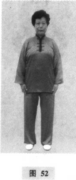 地,全脚踏实。两脚相距同肩宽,重心移于两脚之间。目前平 视。(图52)