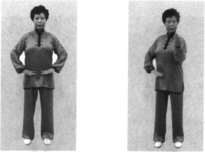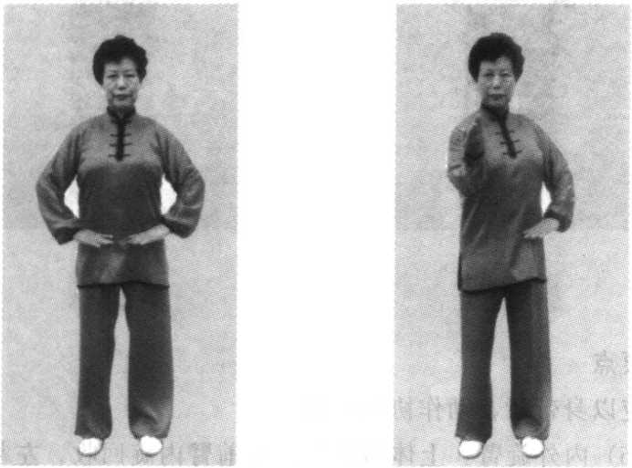 两臂屈肘上提,两手收于腰间,掌心均向下,两掌拇指侧 轻贴腰部;目前平视。(图53)