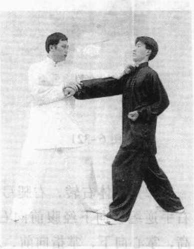 图 6-320图 6-320(2)甲乙相对站立, 乙提左脚向前进步,两手 握拳,用左拳保护自己, 用右拳向甲腹部进攻;甲 身体右转,提起右脚向右 后方撤步,同时抬起右手 向前向上搠接乙右手腕外 侧,屈指握住,向右引采, 随之抬起左手扶按在乙右 臂上侧,沿乙右臂向前转 出,击乙咽喉(图6-320)o