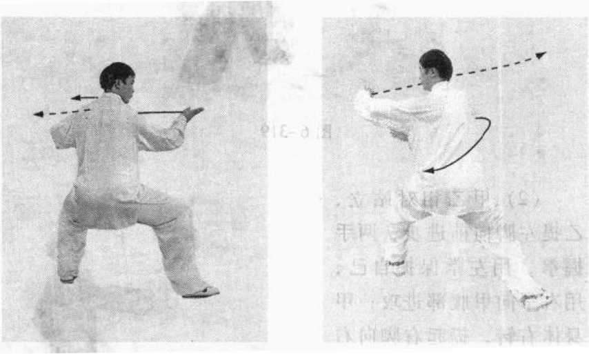 (1)接上势的6-318图。身体左转,左腿弓膝塌劲,右腿 伸直,成左弓步;左手逆缠,向左侧前方转出,手与肩同高, 掌心斜向下,掌指斜向左侧前方,同时右手顺缠,向下经腹前 向左转出,手至左肘内侧,掌心斜向左,掌指斜向左前方。眼 看左前方(图6-321. 322)o