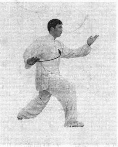 (2)身体右转,右腿弓膝塌劲,左腿稍屈,成左侧弓步; 右手逆缠,向下经腹前向右转至右胯外侧,屈臂,手与胯同 高,掌心向下,掌指向前,左手顺缠,向右前方划弧转至右侧 前方,臂成弧形状,掌心斜向上,掌指斜向前上方;接着,身