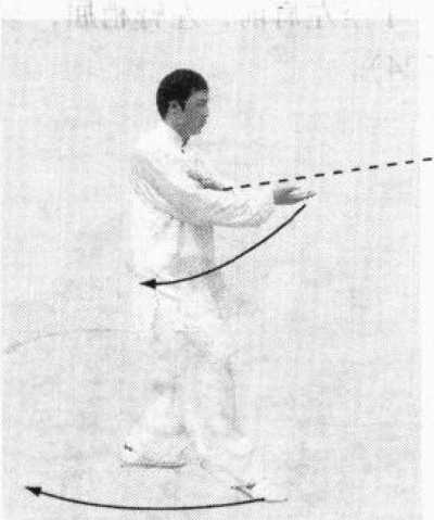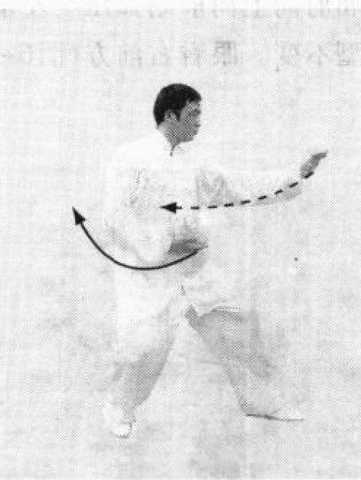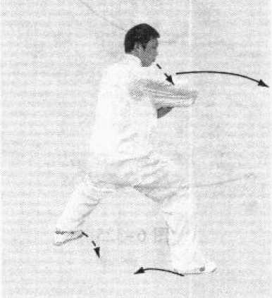 要点:两手向左划弧转出,再向右运转;右肘向前滚压, 随之身体右转,两肘交替,右手转出,接着,右脚向后震踏, 左手同时向前击出,力达左掌。