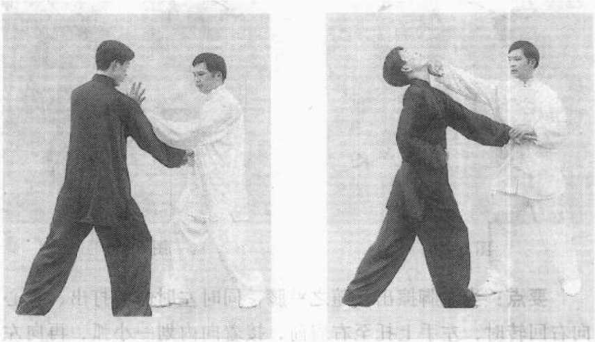 作用:右手引探、左手按的被拿解脱法。.假设有人在我右 侧前方用右手反拿我右腕,并向我胸、面部进攻。我随势向右 转身,松沉右肘,向右引化来势,并用左手贴其腕向前按,以 助左手按化之劲。
