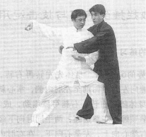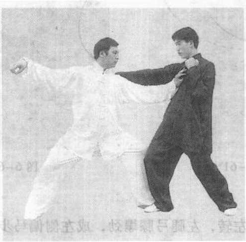 (2) 乙在甲左后侧,提起右脚向前上步,伸双手预想将甲 拦腰抱住;甲身体左转,提起左脚向左前方上步,落在乙的两 脚之间,随之弓膝塌劲,同时左肘向左发力,直击乙胸部将乙 发出(图6 - 59)。