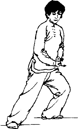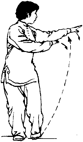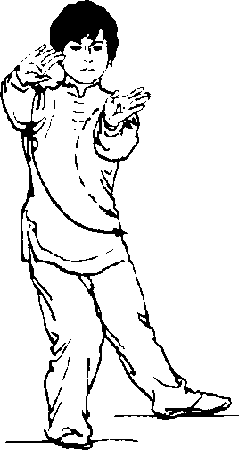 身体左转向左划弧,左H于左 前方,掌心向下,右学朝左胸