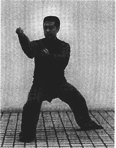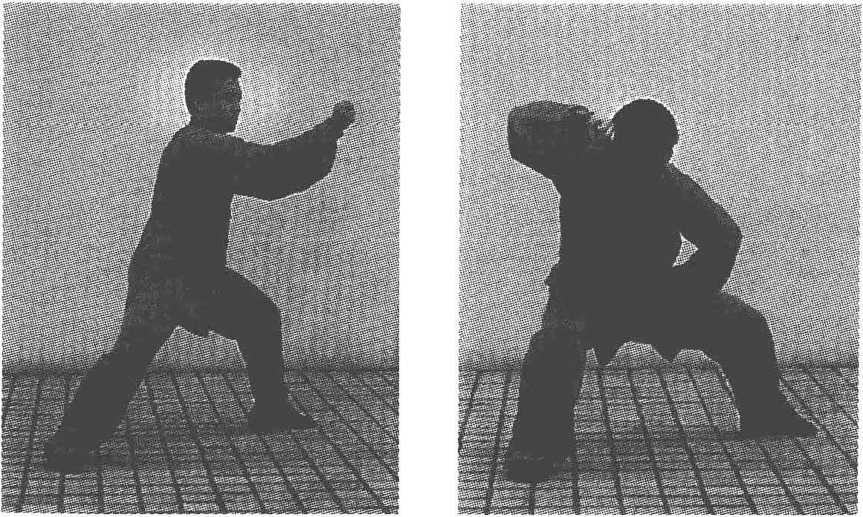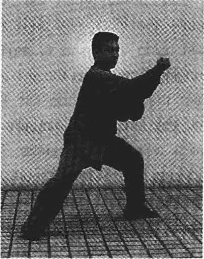 要点:右拳外旋缠转一圈蓄劲,左肩峰、左肘、左脚尖 近似一条直线。背部拔撑有胀热感觉。