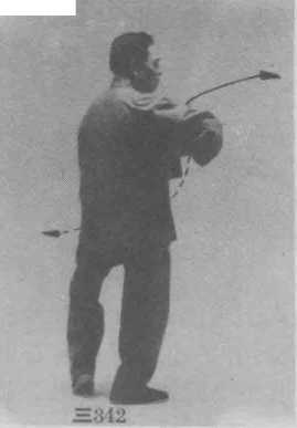 ,双手逆缠向上划弧,右手举于头右侧 上方,手心朝前,指尖朝左上方;左手逆缠向左展开,手 心朝左,指尖朝上;眼看右前方。(图三346)