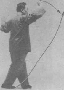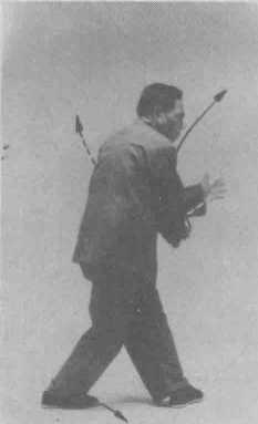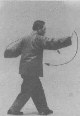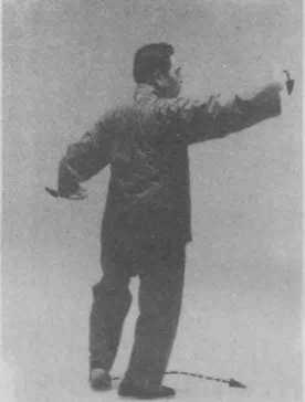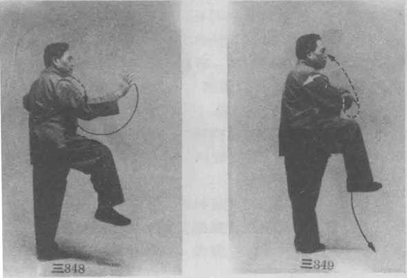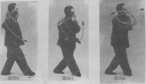 ⑨右腿前伸下落,右脚脚尖外撇落于左脚前一步远 处,脚外侧着地,腰微右转,双手逆缠沿顺时针轨迹划弧; 右手沿上弧线向右运行,左手沿下弧线向左运行,置于身 体两侧,手心朝侧前方,眼看前方。(图三350)