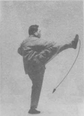 ⑦重心移至左脚,右脚脚面绷平向前上方踢摆,右手 下落迎击右脚脚面。(图三347)