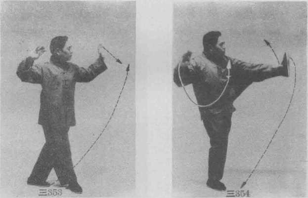 ?两手经面前向两侧分开,手指稍高于肩,两臂自然 微屈,重心移至右脚。随即左腿伸直向前上方踢摆,左手 下落拍击左脚脚面;眼看左手。(图三353、354)