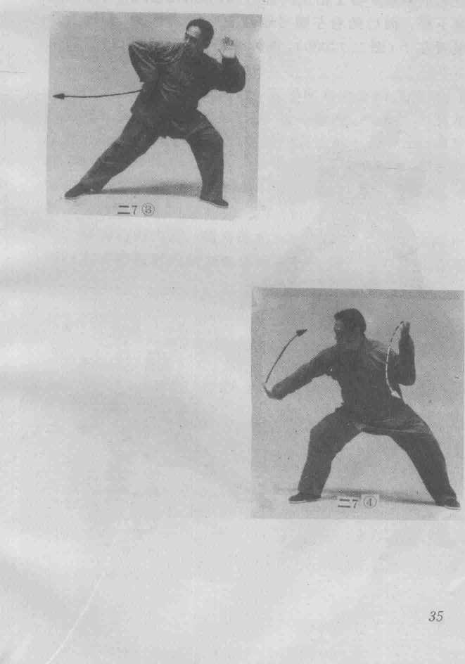 双臂左螺旋缠丝:重心移向右腿,上体微向左转.行 臂屈肘外旋,右手抬至头部右侧;左手屈腕,手背贴左肋 侧下穿,而后随着左腿弓屈向左穿伸.手心反朝后上方; 眼看左手(图二7⑤⑥)。连续练习时.下接图二7③动作,