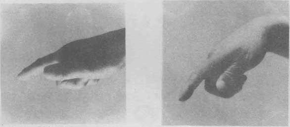 阴八字手:拇指、食指伸直展开成八字状,其余三指 蜷屈握拢.手心朝上。(见阴八字手图)