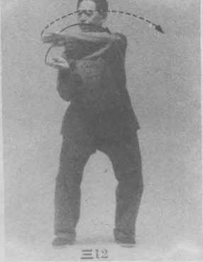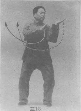 身体重心隐隐地向右上方移 动,上体微微右转,同时左手 先顺后逆缠、右手先逆后顺 缠,沿逆时针的下弧线落经 腹前向右上方绕转,右手手 心朝上,指尖朝前;左手手心 朝前,指尖朝右;视线随着两 手的动作移动。(图三12)⑥上体微微左转,同 时左手顺缠、右手逆缠经面 前向左划弧,两肘尖向下垂 坠,左手手心朝上,指尖朝左 上方;右手手心朝下,指尖亦 朝左上方;头略向左转,眼看 左手指尖。(图三13)