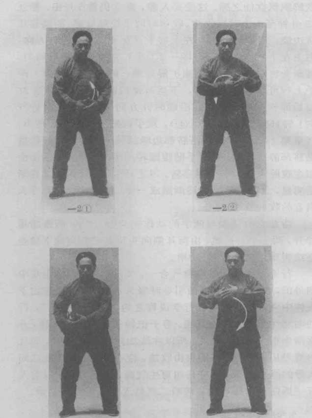 行吐纳采气法的练习。吐纳采气法是用口鼻进行深呼吸 的一种功法,此功与普通深呼吸的不同之处是鼻吸口呼, 同时肚脐亦随呼而收缩,随吸而展放。此功应在每日卯时 (早五至七时)于公园绿地等空气清新处进行练习。具体 练法是:两腿平行开立,距离约同肩宽。双手叠放轻贴小 腹。全身放松。行功时要先吸后呼,吸气时舌舐上颗,空 气要轻、慢、细、匀地由鼻孔缓缓吸入,边吸边用意领气 从祖窍经百会、过玉枕、下夹脊到命门直穿中丹田,同时 肚脐也随着吸气缓缓地向外充展。当吸到不能再吸时(脐 部也不能再向外充展),便将嘴唇稍稍张启,舌尖抵向下 牙根处,以意行气由丹田上行经口缓缓呼出,肚脐也随着 呼气慢慢向里收缩。当气呼尽时便再开始吸气。如此一呼 一吸为一次,呼即为吐,吸即为纳,往复吐纳36次后便 可按无极站桩功的收功方法揉腹摩面收功。