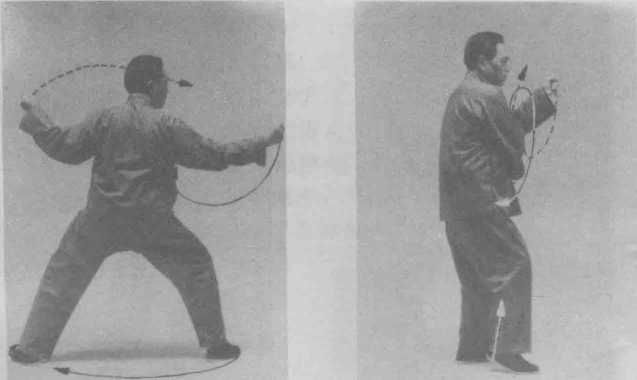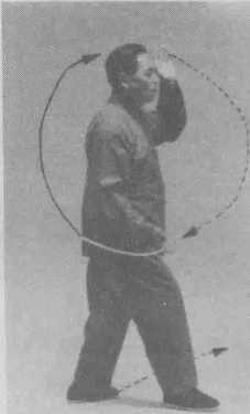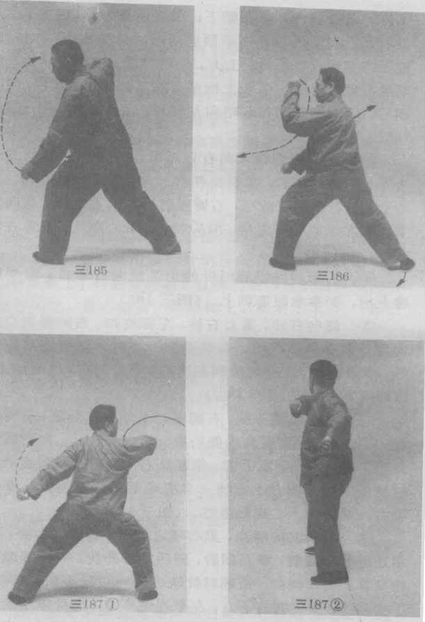 @右拳逆缠沿顺时针的上弧线向右划弧;左拳顺 缠上抬,两拳拳眼皆朝上。(图三188)