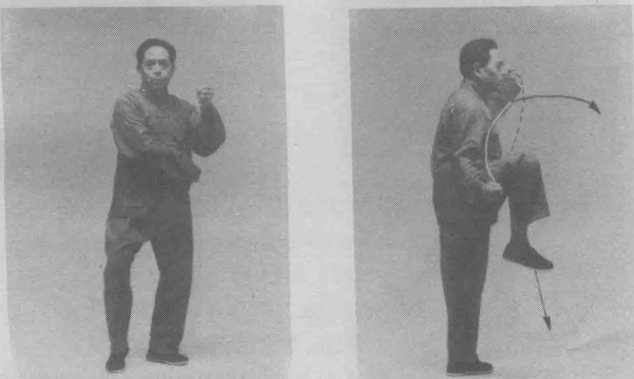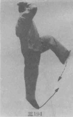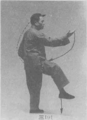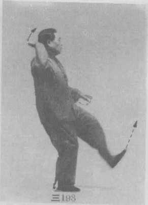 ⑥ 右腿屈膝上提,右脚不勾不绷自然悬垂;右臂外 旋,右拳顺缠经左臂弯内侧沿顺时针轨迹向上、向右弧形 翻砸下落,拳心朝左上方,拳眼朝右上方;左拳顺缠沿顺 时针的下弧线向左上方绕一半圆形至头部左前方,拳心 朝右,拳面朝上;眼看前方。(图三190)
