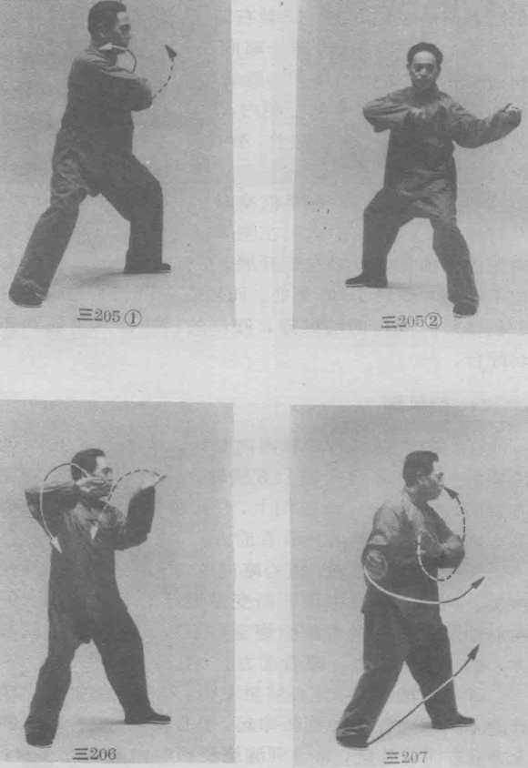 ② 腰微向右转,重心略向右偏移,右臂外旋,左臂 内旋,两拳左顺右逆缠渐渐变掌继续沿顺时针的上弧线 向右绕转,再左逆右顺缠绕至右下方,两手手心朝右前 方,指尖朝右上方;眼看前方。(图三206、207)