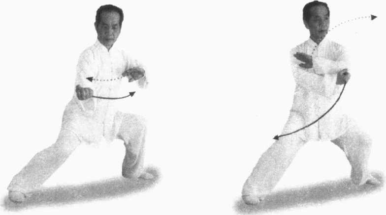 要 领:三小节连起来是快速动作,充分体现出劲走缠丝, 螺旋,腰活似车轴。第一节展开,二节紧凑,三节又展开。这是 搀放、展开、紧凑的密切配合协调动作。要求做到展开不散乱, 紧凑中又舒展。