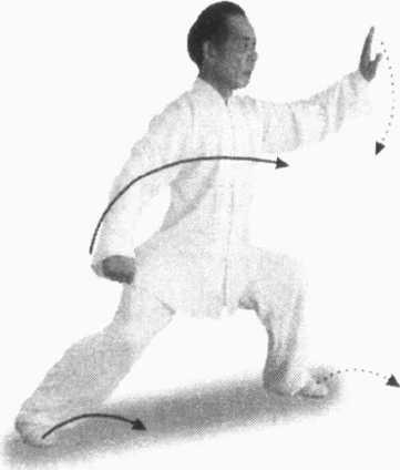 三节:身体向左转螺旋下沉,重心渐变偏左前,呼气,眼左 顾右盼,耳听身后。同时沉肩,含胸,松胯,屈膝。右腿逆缠里 合,右脚五fit抓地。左脚尖上翘,以脚跟为轴腿顺缠略外旋,脚 掌落地,脚心空,膝里扣与右膝合,同时左掌逆缠由右肩前向右 外旋开略上,再向左前展开变顺缠,劲运中指肚,指尖略偏右 上,高度与耳同,掌心向前。右拳由左肘里下逆缠内旋经胸前下 至右膝上自然下垂,拳心向后(图17-3,图17-4,图17-5)。