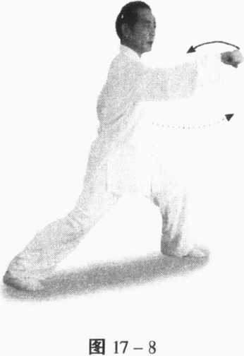动作五:身体向左转螺旋上升,重心变偏左前,先吸后呼, 眼看右拳,耳听左后。同时先沉肩,含胸,松胯,屈膝合。两脚 五趾抓地。左膝里扣,右腿逆缠里合,上下相合。左手略逆缠下 沉略向里后,右拳贴胸下逆缠里旋,沉肩,坠肘,里勾腕逆缠上 翻,这是蓄势,吸气。随身左转螺旋上升,左胯松,左膝扣,右 脚腿逆缠向右后蹬。同时左掌变半虚握拳,逆缠随左肘向右后下 略偏左外发劲,拳心向下,高度与右肩平(图17 - 8)。