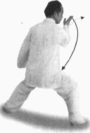 二节:身体继续左转螺旋下沉,沉肩略坠肘,胸开左转渐 含,腹左转略前突下沉,松胯,屈膝合。臀部左沉右后前旋转略 突出,略上翻起,吸气,重心由左后变偏右前。同时右腿继续逆 缠里转。左腿顺缠外转,膝里扣。两脚踏实,五趾抓地,涌泉穴 虚。同时右手在右前方顺缠里合,随身左转,略划下弧再向左略 上以小指领劲,至鼻前中线。向右后折腕,掌心向左前偏上,指 尖向右前。同时左手逆缠以大拇指领劲,继续向左侧后转,划小 半外弧,加强棚劲,位在左胯外约30厘米掌心向左下,指尖向 右前略偏下,眼瞻前顾后,耳听身后(图24-l)o