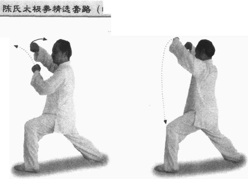 要领:身体右转双拳逆缠动作较快。双顺缠身体右转下沉 合时要稳稍慢。双逆缠双拳左上贴肋,右拳指裆时略快,运劲要 柔中寓刚,指裆捶含蓄不发劲。