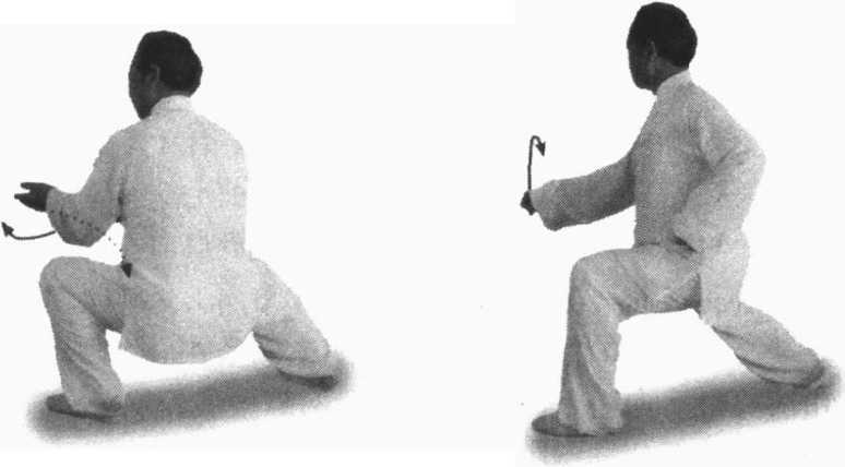 再向左转约45度 螺旋下沉,再继续向左转约45度螺旋微微上升,先吸气后呼气。 同时,先沉肩,开胸,突腹左旋下沉,松胯,圆裆,臀部向右后 I:翻,屈膝含。再沉肩坠肘,含胸塌腰,松胯,合裆,敛臀屈 膝。再沉肩坠肘,开胸,突腹,左旋微上旋下沉,松胯,扣裆, 沉左臀,屈膝合。同时,左腿先逆缠里转,再顺缠外转,膝里 扣,脚掌踏实,五趾抓地,涌泉穴要虚°同时,右腿先顺缠外 转,膝里扣,再逆缠里转,脚掌踏实,五趾抓地,涌泉穴要虚。 同时,双拳逆缠里转,略向上起,位在头前上方,双拳心向前略 偏上,再变双顺缠下沉,经胸前至腹前,右拳合于左肘弯上,臂 屈半圆上勾腕,拳虚握,拳心向上,虎口向前上。左臂伸至七八 分,略里上勾腕,拳虚握,拳心向右后上,虎口向左前上方,位 在两膝中线前略下。双拳变逆缠里转,左拳向上里转收回合于左 肋部,拳心贴肋部,虎口向上。同时,右拳贴在肘里侧先粘连里 转,由肘臂里下向右下方指出,位在两膝中线身右侧,拳心向 下,位在两膝下。重心是左——右一左。眼先看双拳再看右侧 前下方,耳听身后(图30-4,图30-5,图30-6,图30-7)。