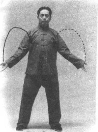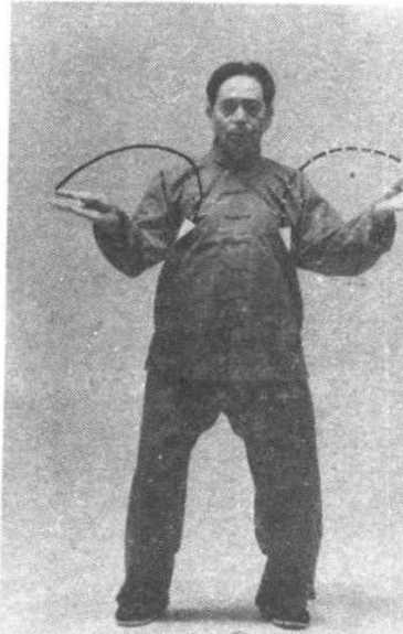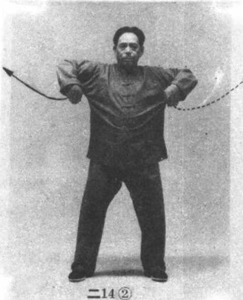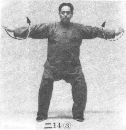 自无极式始,两臂渐渐外旋,手心翻转朝外,随即两 臂内旋,抬至肩平,屈肘、屈腕,两手收经腋下平向两侧 穿伸,手心朝后;两腿屈膝略蹲。而后两腿渐渐蹬直,两 臂外旋屈肘,两手缓缓向里收拢,两手心斜相对,指尖斜 朝外,眼看前方(图二14①②③④)。连续练习时,下接 图二14②的动作。两臂的运行要圆转自如,并与两腿的屈蹲、蹬直相配合。练习数次后接做收式。二1*