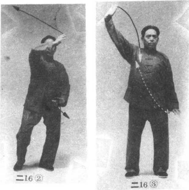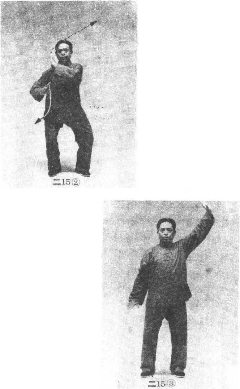 自无极式始,右臂屈肘上抬,右手侧立起,手心朝左, 左臂外旋屈肘,左手经胸前向右前臂内侧穿伸,重心渐渐 向右腿偏移,两腿屈膝略蹲,随即左手随前臂内旋向左上 方伸展,手心朝左上方,指尖朝右上方;右手随着前臂内 旋弧形落向右胯侧,手心朝后下方;两腿随左手上伸渐渐 蹬直;眼看前方(图二15①②③)。动作要柔和缓慢,周 身无一处紧张用力。练习数次后接做收式。15. 左下右上螺旋缠丝动作与左上右下螺旋缠丝相同,惟方向相反(图二16①②③)。练习数次后接做收式。 ’二16①