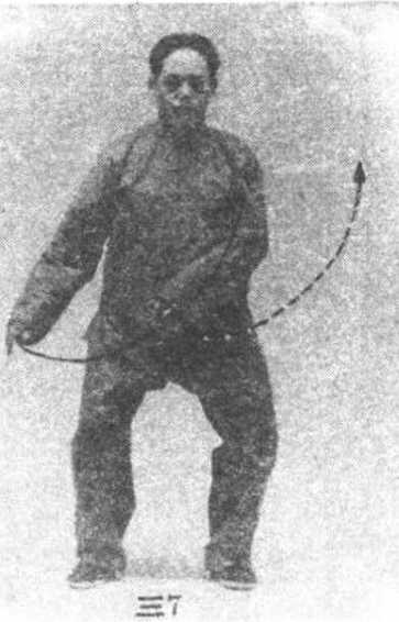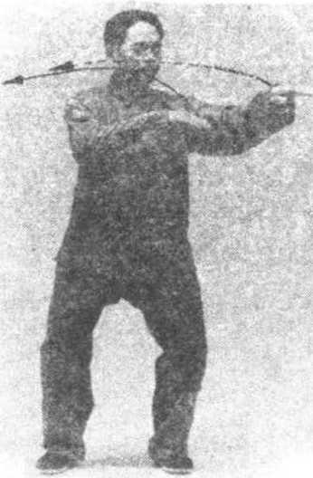 ② =8=8在腰胯的带领下, 上体微向左转,身体重心略 向左腿偏移。两臂松沉下垂, 俄顷,两手以手背领先,带动 两臂沿顺时针的左弧线向左 前上方挪抬,两臂微屈,两腕 高与肩平;眼看左手前方。 (图三8)